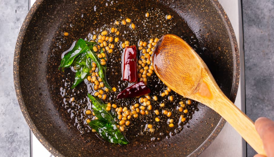 • Heat 1 tablespoon oil in a pan, add 1 teaspoon mustard seeds, and let them pop.