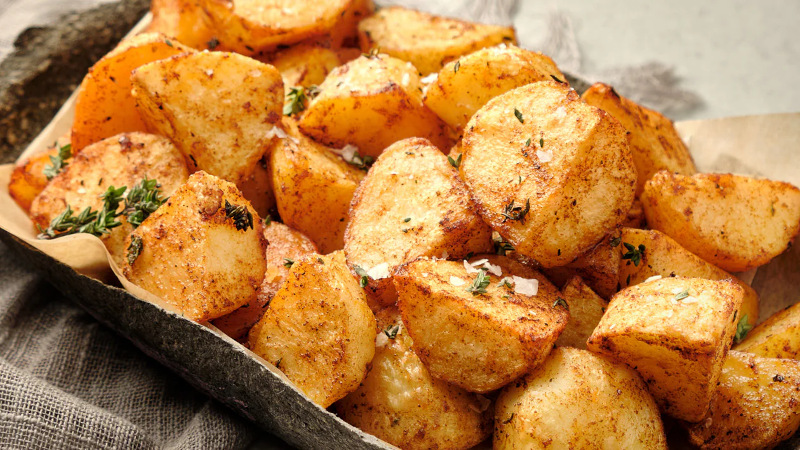 Toss diced potatoes with olive oil, paprika, salt, and pepper.